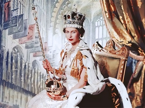 1953年6月2日,伊丽莎白在威斯敏斯特大教堂加冕,正式成为英国新一任女王,全称“托上帝洪恩,大不列颠及北爱尔兰联合王国以及其他领土和属地的女王、英联邦元首、基督教的保护者伊丽莎白二世”,这一年她27岁。