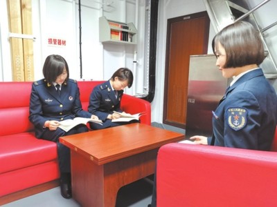 ▲在海军乌鲁木齐舰的女兵活动区,女兵们正在看书学习。