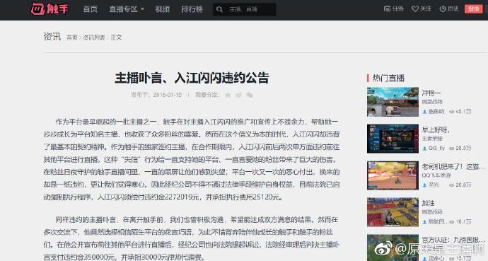 小编去翻看了触手TV的公告,确实有入江闪闪违约的公告依然挂在触手TV的官网中。