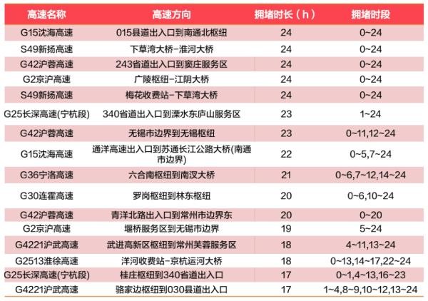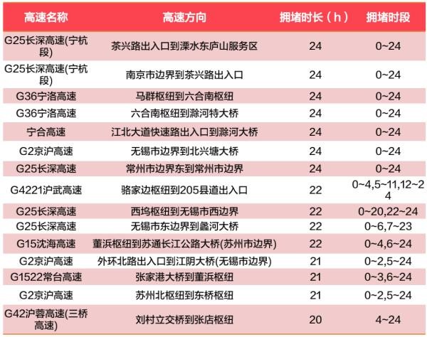 春节前,省内高速易拥堵缓行路段主要是:G1522常台高速苏州段,预计拥堵延时指数约为10.4,平均车速约9公里/小时,其次是G36宁洛高速南京、滁州段,G15沈海高速苏州段等。