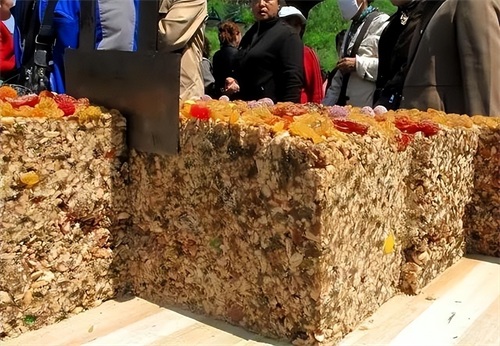 切糕融合了不同民族的烹饪技艺,是文化交流的杰出产物。其主要原料包括核桃仁、玉米饴、葡萄糖汁、杏仁、葡萄干、巴旦木等,这些原料的选择和搭配体现了新疆地区多民族的饮食文化特色。在制作过程中,不同民族的传统工艺相互融合,使得切糕具有独特的口感和风味。例如,在压制环节,经验丰富的师傅们会用木棍反复碾压,使干果与面团充分融合,这一工艺既需要力量,又需要技巧,是多民族智慧的结晶。