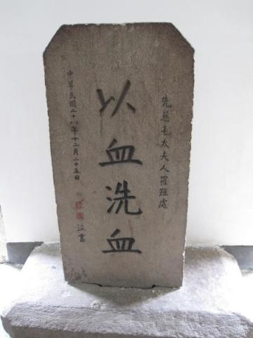 “小洋房”最非凡的地方,是屋内有一石碑,刻着蒋经国手书的“以血洗血”四字,表示他对日本侵略者的痛恨及替母复仇的决心。1939年12月12日,日军飞机轰炸溪口,蒋经国母亲毛福梅不幸罹难。蒋经国接获噩耗赶回家,愤怒不已的他,在母亲死亡地点立了“以血还血”的石碑。因当时没有时间看风水选宝地,蒋经国只好暂时把母亲遗体安厝在她常去诵经念佛的家庙摩诃殿内,并在1946年正式下葬于殿旁。坟墓坐西北朝东南,四面有石头围护,看起来简单端庄。墓碑上的“先妣毛太君之墓”由蒋经国老师、国民党元老吴稚晖题写。