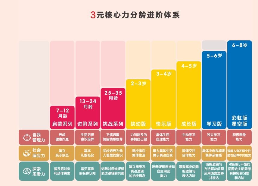 回归用户需求,新生代父母越来越注重孩子学习、能力、习惯、兴趣的全面培养,事实上,不同年龄阶段,孩子的心智成长、学习能力、知识吸收程度均有所不同。为此,巧虎升级乐智小天地,打造出3*3*3独有立体教学模式,搭载专注培养孩子智力的巧虎开心成长系列产品,结合巧虎APP的寓教于乐和早教中心的互动式引导,在陪伴亲子家庭轻松快乐成长的同时,全方位培养孩子的“三元核心力”,即自我管理力、社会适应力、探索思考力。