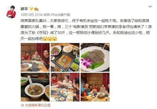 郎平社媒并配文:“浪浪为了拍《夺冠》减了30斤,这一顿我估计得涨好几斤,朱和姚迪也没少吃,明天一起加练吧。”