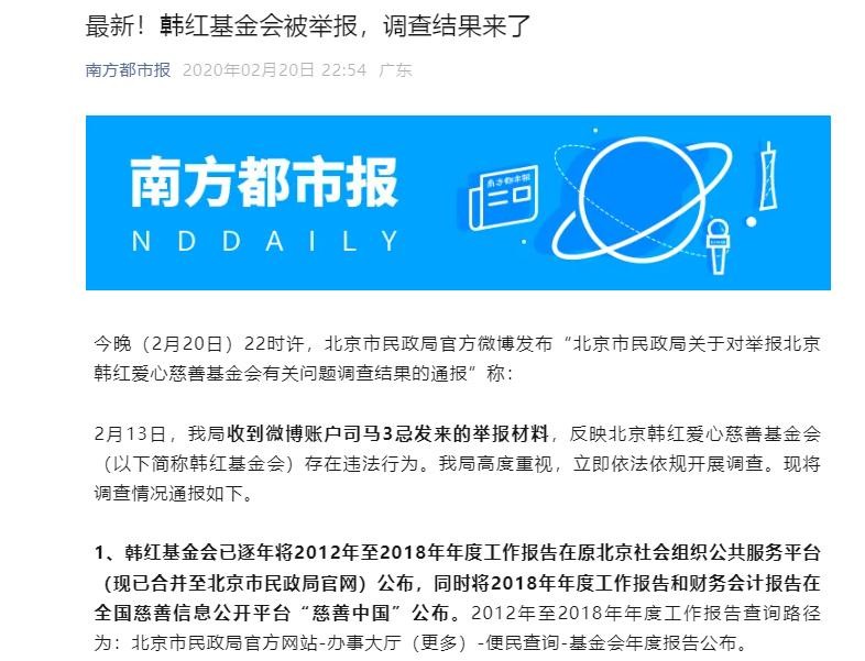 南方都市报:最新!韩红基金会被举报,调查结果来了