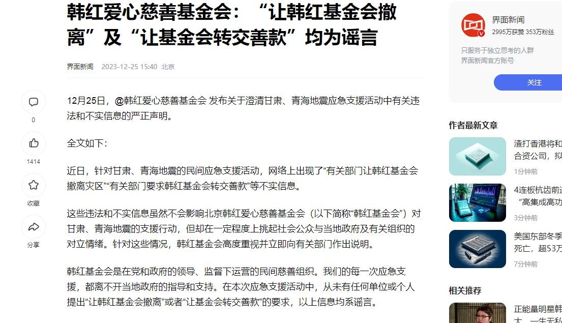 界面新闻:韩红爱心慈善基金会:“让韩红基金会撤离”及“让基金会转交善款”均为谣言