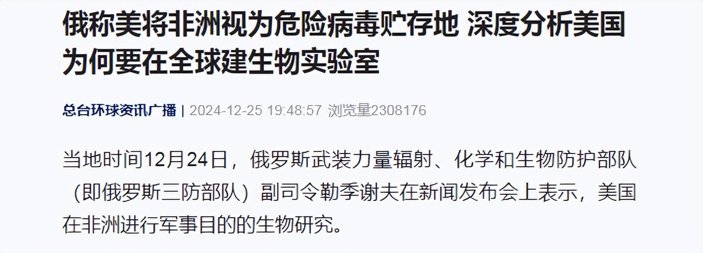 根据俄罗斯权威媒体《今日俄罗斯》在2024年12月24日发布的消息称,美国目前正在抓紧时间在非洲地区开展生物实验室。