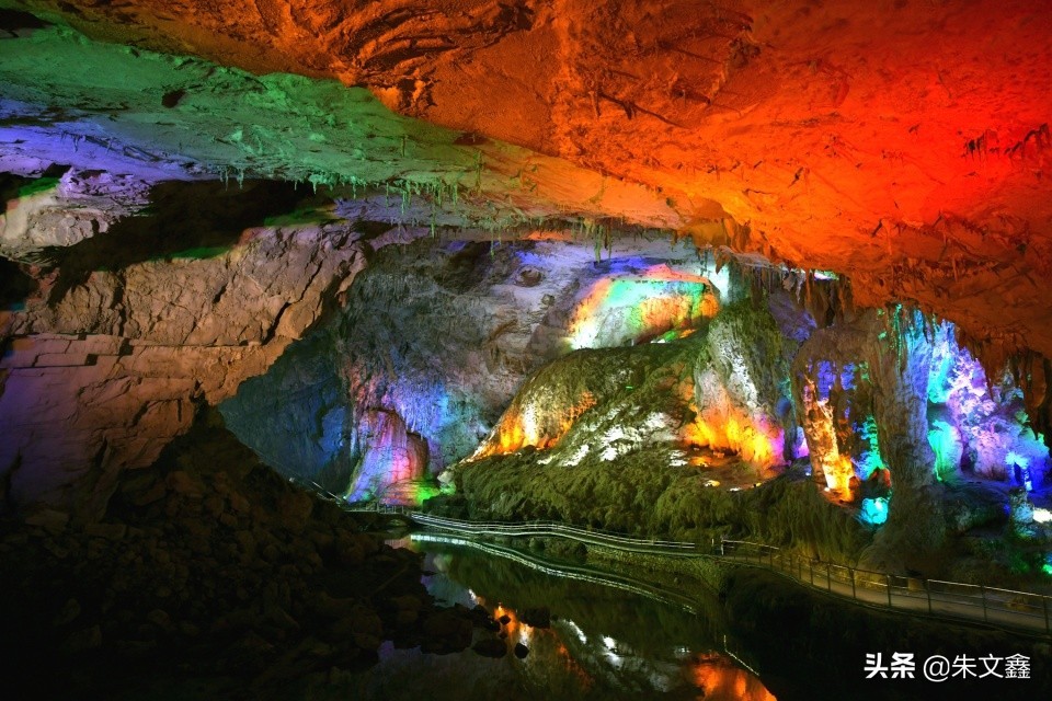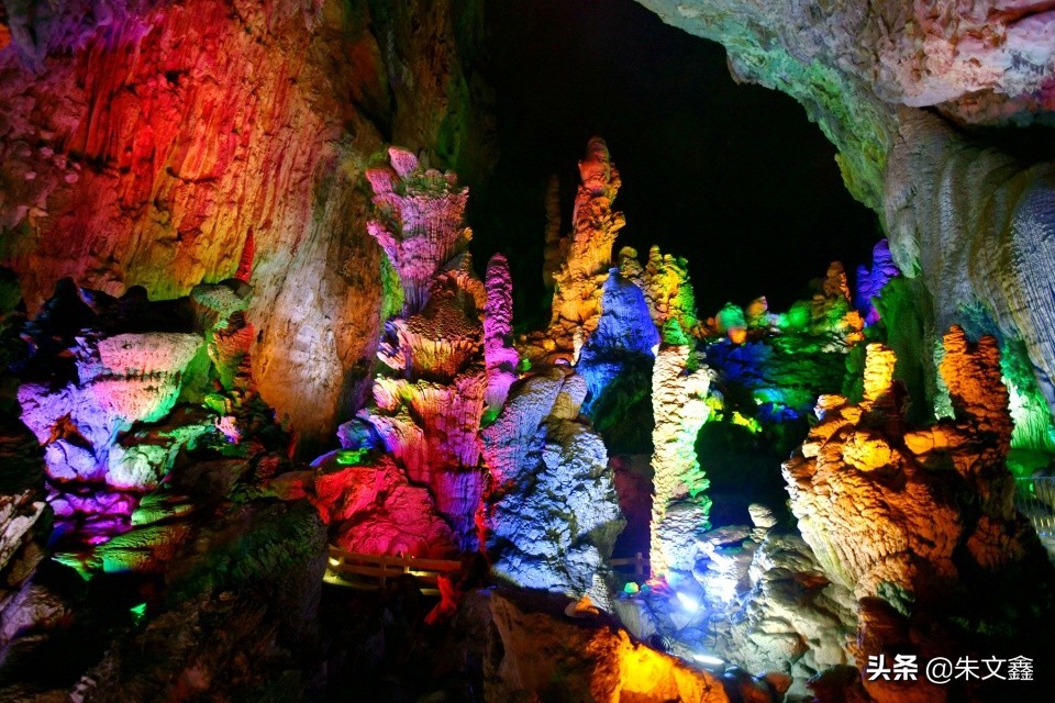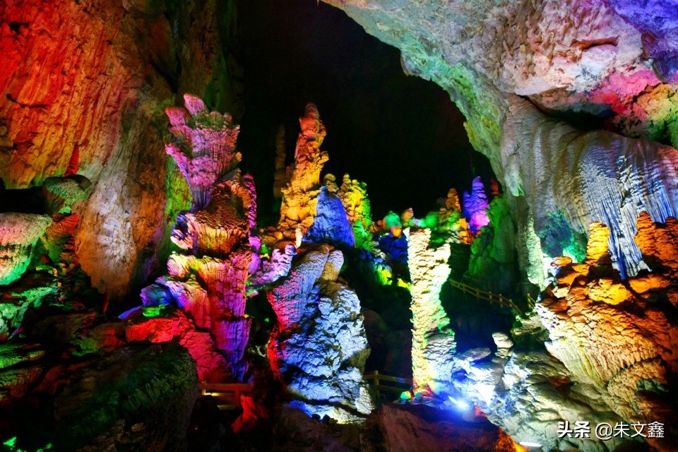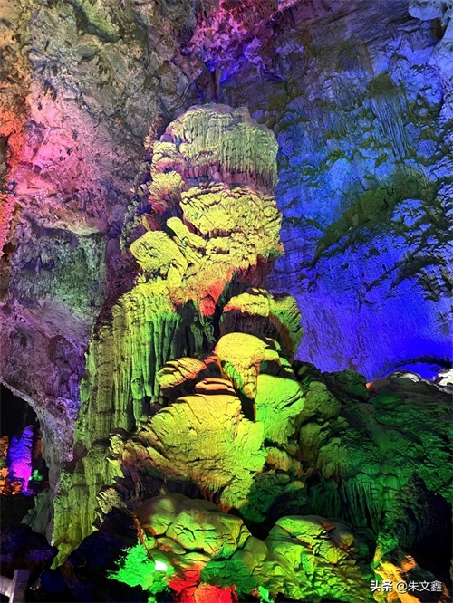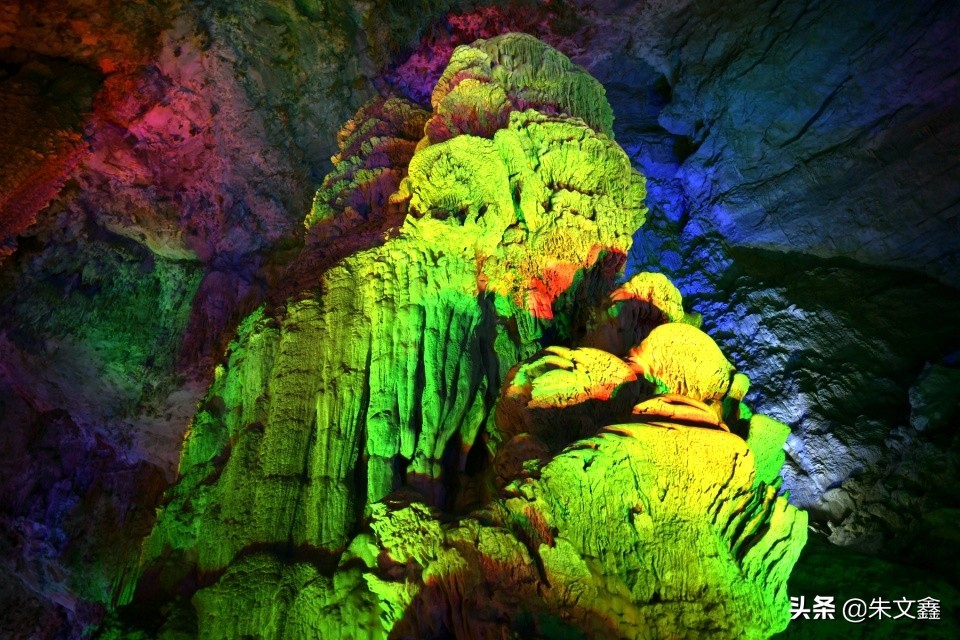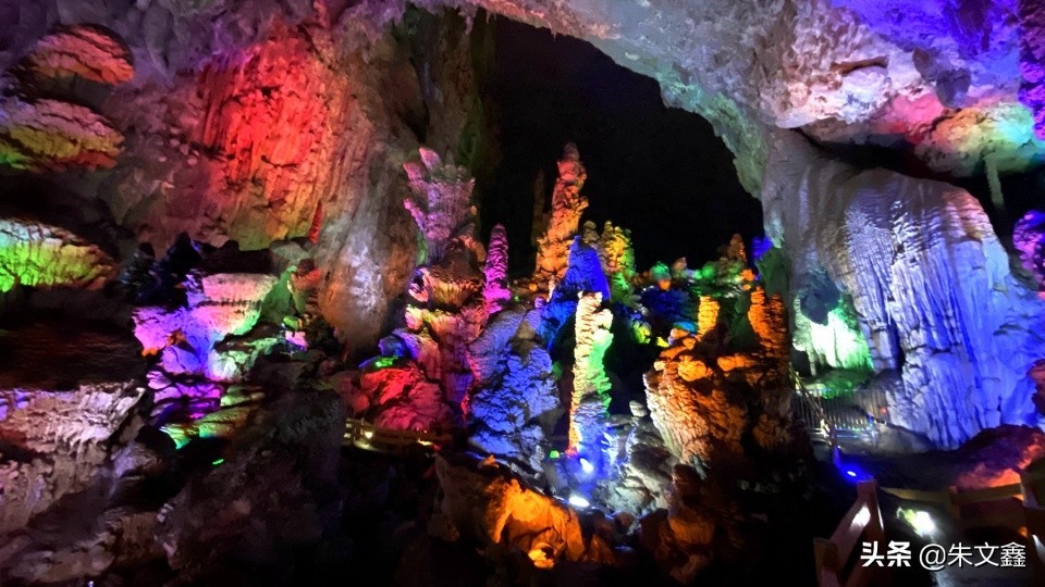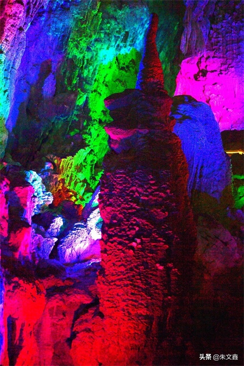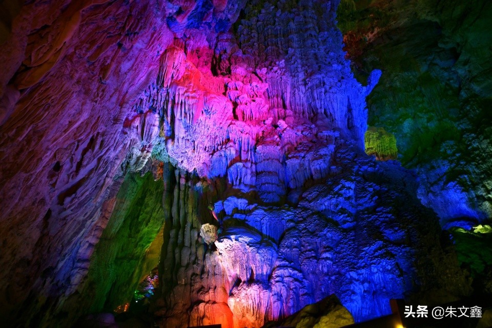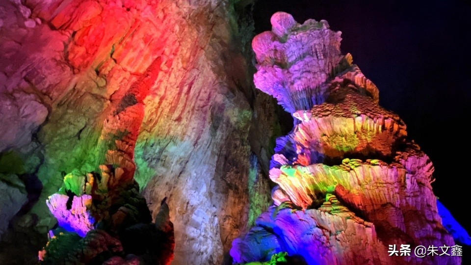 沿着洞中小路登临"天窗",俯瞰空谷,忽觉那一株株高出人头的果树,恰如一列列伏波的幼苗,依偎在大山古洞的旷袤深邃中。南洞的二、三楼洞的皇帝宫殿、迷魂宫更加瑰丽多姿,有的如帆出海,百舸争发;有的像群仙席地,各具形情;有的如卧室装饰,枕被俱全,壁上挂镜闪闪发光,不啻鬼斧神工,天造地设。