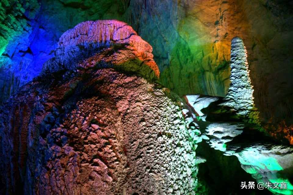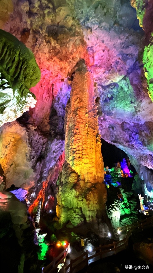 随行的导游小哥说,百魔洞分为4个大殿堂,辉煌瑰丽,多姿多彩,让人看了留连忘返。其中最为壮观的是那个100多米高,几百米宽、1000多米长的大殿堂内,几十个钟乳石柱,构成庞大的石塔群,挺拔高耸,雄伟壮丽,让人惊叹不已。加上洞中雾气缭绕,变幻无穷,更使这个巍巍景观显得诡秘多姿。这些巨大的钟乳石塔,是经过几亿年岩溶发育的结晶,其中最大的石笋需十人方能合围,最高的石柱达39米,实属"天下之最"。
