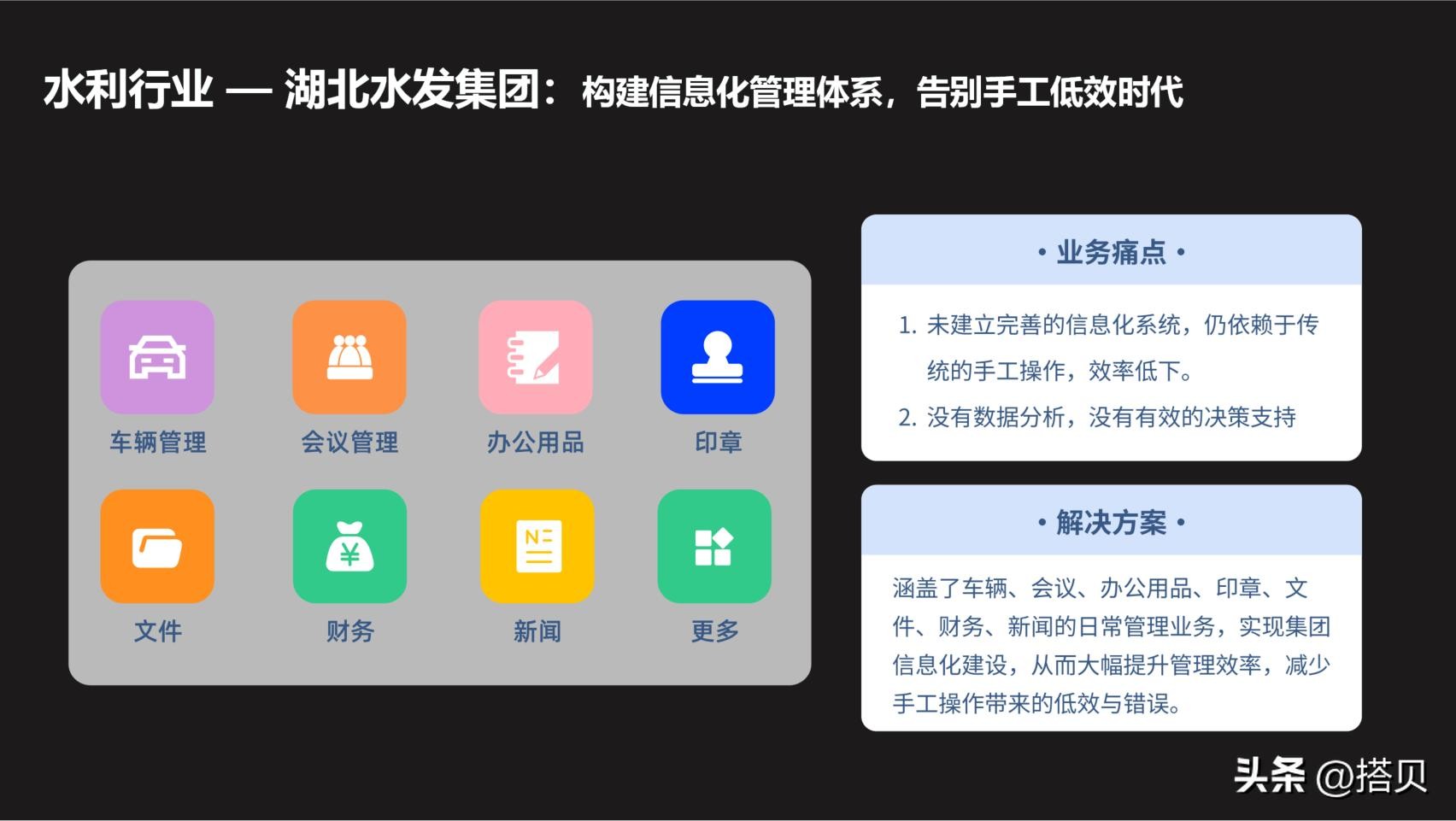 下面以搭贝OA办公系统客户为例,来介绍一下相关应用场景 客户案例:水利行业——湖北水发集团