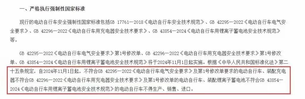 新规说了,从2024年11月1日开始,那些不符合GB42295—2022、GB42296—2022、GB43854—2024标准的电动自行车,就要“退休”了。这三个标准,包括了电动自行车本身、充电器和电池,都是为了让电动车更安全、更规范。