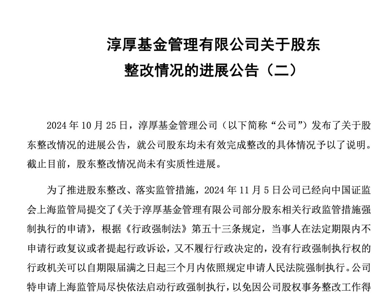为了推进股东整改、落实监管措施,淳厚基金表示,在11月5日已经向证监会上海监管局提交了《关于淳厚基金管理有限公司部分股东相关行政监管措施强制执行的申请》。