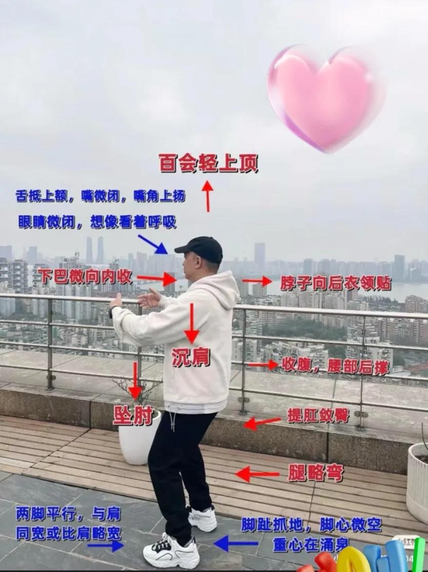刚开始站桩应该注意什么,那肯定是桩形,桩形中最要紧是头顶虚悬,含胸拔背,收腹敛臀,其他细节方面可以留言相互交流。站桩的第二步是要注意呼吸和重心,要舌抵.上额,微闭嘴巴,两嘴角上扬微笑状,呼吸要细长,眼睛微微闭上,女生关注膻中穴,男生关注气海穴。