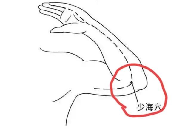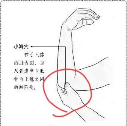 小海穴其实笔者前面的文章有过详细介绍,所以我们就简单回顾一下这个穴位。小海穴出自《黄帝内经》,属手太阳小肠经。这个穴位的定位非常简单,它就在我们的肘关节上。《针灸学》载:“小海穴在肘内侧,当尺骨鹰嘴与肱骨内上髁之间的凹陷处。”其实它还有一个非常简便的取穴方法。你先屈肘,然后找到肘尖最高点与肘部内侧高骨最高点,两者间的凹陷处即是小海穴了。