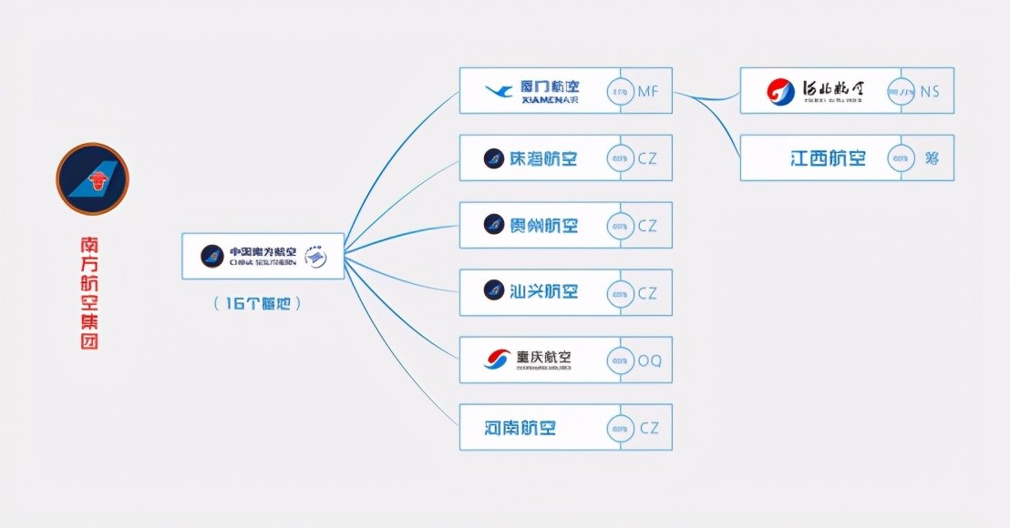 国内的航空公司目前主要分为国有企业及民营企业,而国内航空业基本被四大航空公司和小部分民营企业主导着,像四大航空集团为中国国际航空股份有限公司、中国南方航空股份有限公司、中国东方航空股份有限公司、海南航空公司,四大航空集团控股着国内大部分的航空公司,像厦门航空就是属于南方航空公司控股,而江西航空又属于厦门航空控股,典型的三代并存关系,而四川航空又为山东航空、南方航空、东方航空三家公司控股,典型的三个爸爸,还有就是国内以及较为出名的民营企业像上海吉祥航空有限公司、春秋航空股份有限公司等,两个典型的案例,吉祥航空是服务标榜,而春秋航空被广大飞友戏称为空中绿皮车,具体的航空公司控股关系以及集团系可以看下面的图片,每一个航空公司还有专业的代码和标志,这个代码就是在登机牌上航班号前面的字母,例如MU就是东方航空的代码、CA是MF是厦门航空、3U是四川航空、SC是山东航空、ZH是深圳航空、9C是春秋航空等等。