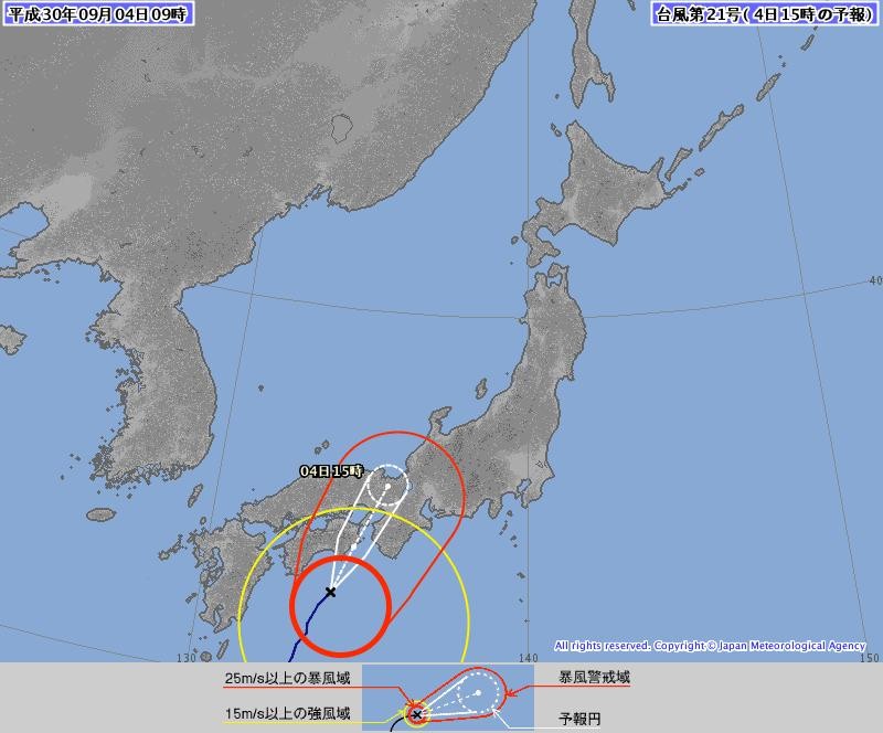 根据目前的消息,台风飞燕将以每小时70千米的超高速度飞速登陆日本南部沿海。根据日本气象厅的定强,台风飞燕或以25年来日本最强登陆台风的级别在日本四国岛-纪伊半岛登陆,日本的大阪、神户等城市可能将遭遇台风正面侵袭,这也可能成为日本大阪1961年以来遭遇的最强台风袭击。