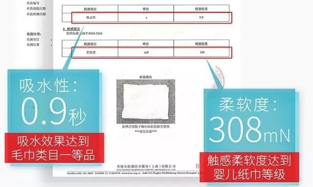 ▼甚至都有检测报告,证明其比一等毛巾还要吸水,比婴儿纸巾还要柔软亲肤。