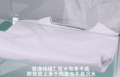 ▼而普通的 T恤即使放上鸡蛋下压,也不会立马就沉水。