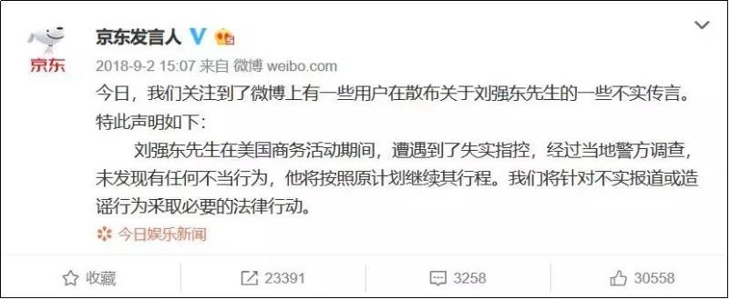 @京东发言人 回应称,“刘强东先生在美国商务活动期间,遭遇到了失实指控,经过当地警方调查,未发现有任何不当行为,他将按照原计划继续其行程。我们将针对不实报道或造谣行为釆取必要的法律行动。”