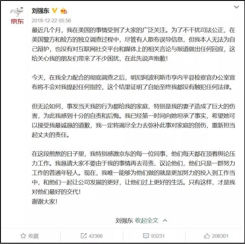 2018年12月,美国检方曾决定不予刑事起诉刘强东,宣布他无罪。