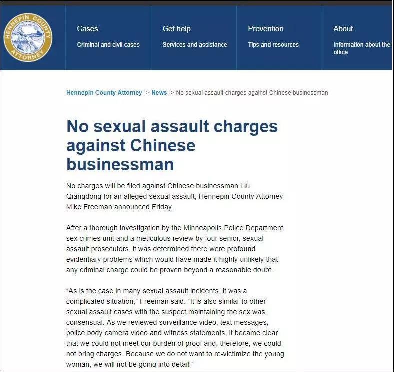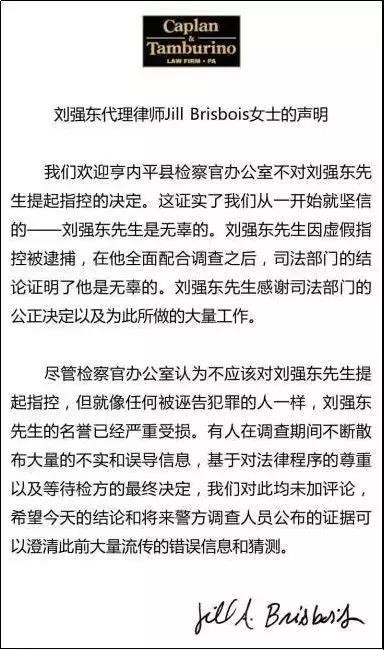 刘强东代理律师Jill Brisbois女士就案件事实发表公开声明,“欢迎亨内平县检察官办公室不对刘强东先生提起指控的决定”。