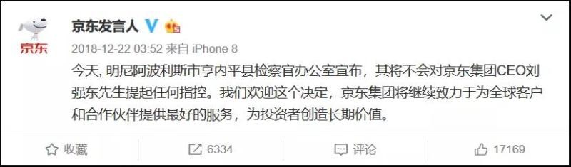 @京东发言人 发布微博,称:今天,明尼阿波利斯市亨内平县检察官办公室宣布,其将不会对京东集团CEO刘强东先生提起任何指控。我们欢迎这个决定,京东集团将继续致力于为全球客户和合作伙伴提供最好的服务,为投资者创造长期价值。