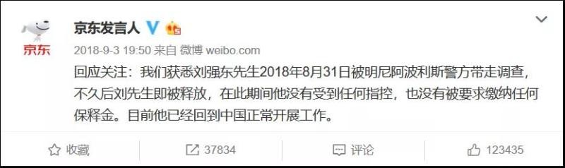 @京东发言人 发布微博,称“我们获悉刘强东先生2018年8月31日被明尼阿波利斯警方带走调查,不久后刘先生即被释放,在此期间他没有受到任何指控,也没有被要求缴纳任何保释金。目前他已经回到中国正常开展工作。”