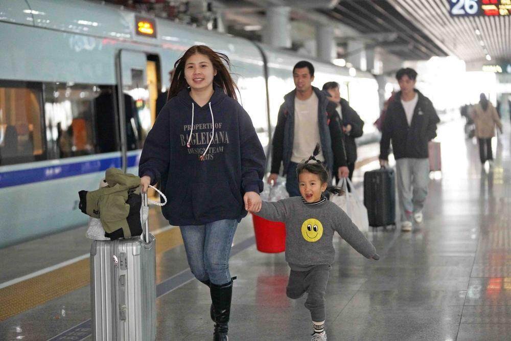 拉着妈妈的手,坐高铁回家过年(邓鼎园 摄)