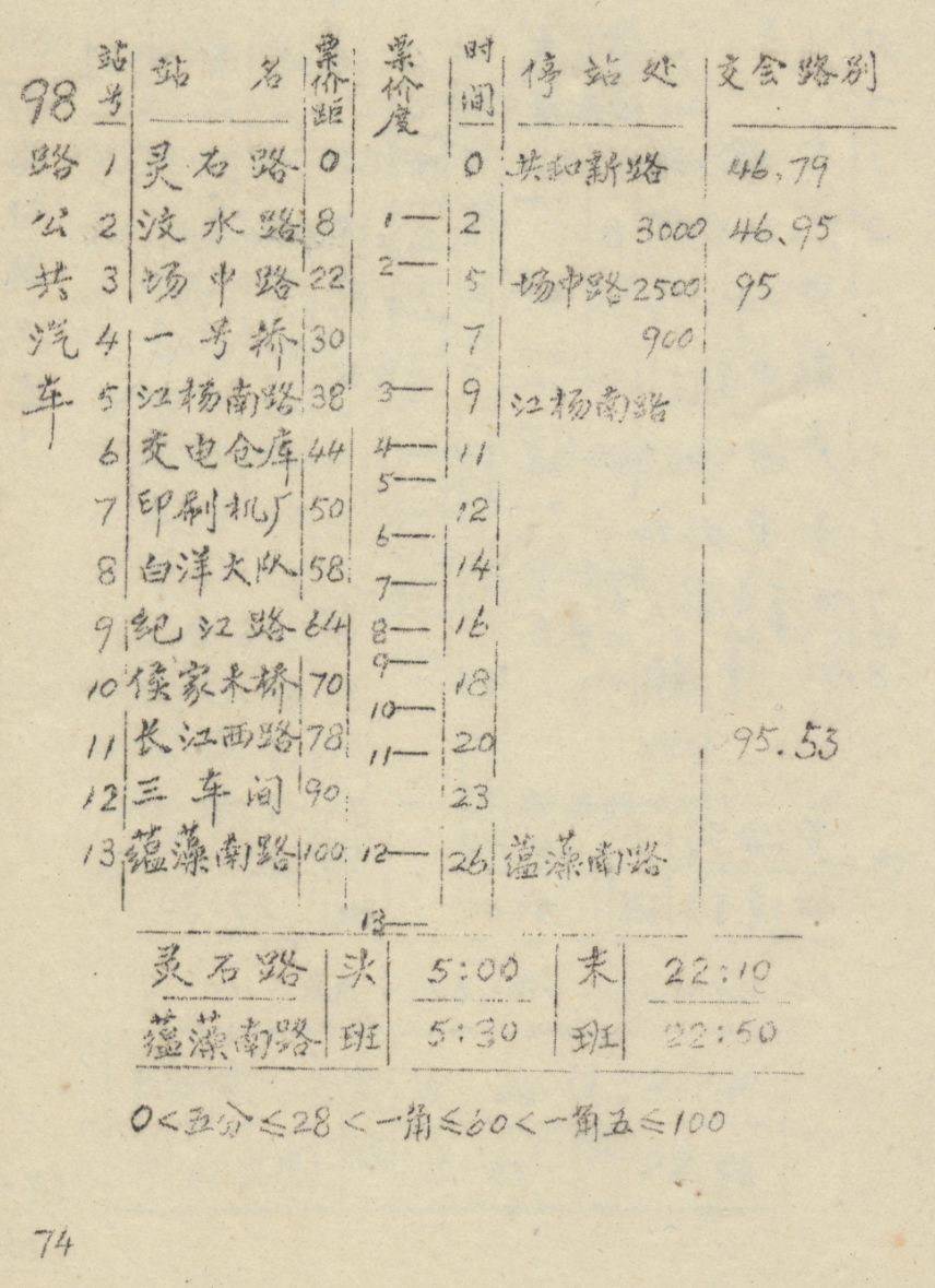 1974年公交指南中的95路和98路线路信息表