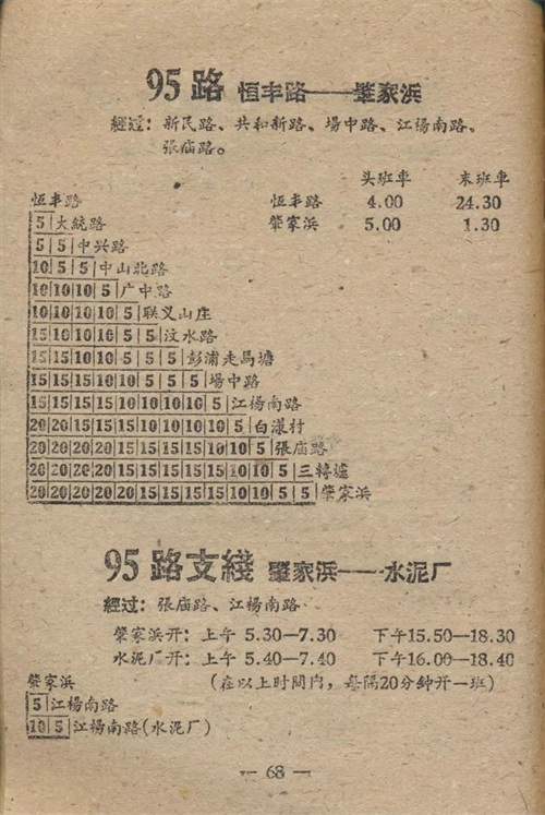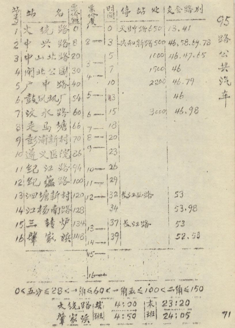 1960年公交手册中的95路站名票价表