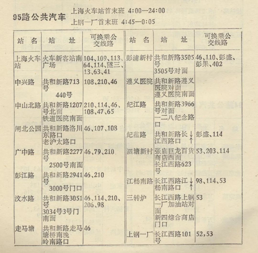95路调整为上海火车站(南广场)至呼兰路通河路(原114路终点站处),不再经过长江西路西新桥往东至上钢一厂路段。