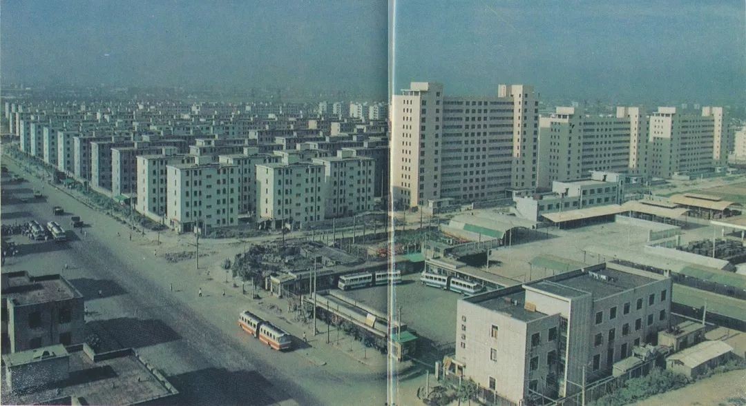 1980年代彭浦新村共和新路临汾路口一带鸟瞰,图中枢纽站为当时46路终点站