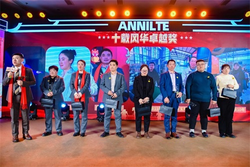 而颁奖典礼的特别环节——十载风华卓越奖,更是将现场气氛推向了顶点。这些获奖者用十年的青春与安耐共同成长,成为了各领域的精英。他们的坚持与奉献,为安耐的今天奠定了坚实的基础。颁奖现场,高总、修总以及入职安耐十年以上的老员工都动容不已,泪水与笑容交织在一起,共同诉说着这份深厚的情感。