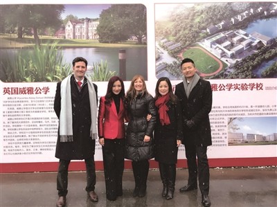 威雅公学大中华区董事长威廉(William Vanbergen)(左一),英国威雅公学国际总监白雪兰(Sara Brazendale)(中),威雅公学大中华区发展总监袁博(右一),杭州萧山威雅公学校董金华琴(右二)及金铃(左二)