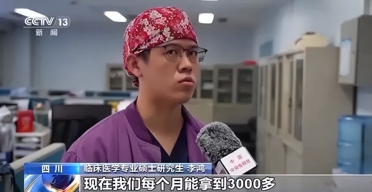 在央视报道中,临床医学专业硕士研究生李鸿就表示:“现在我们每个月能拿到3000多,这还算比人家高的了,后面每年可能会涨500块。稍微还是偏低了,因为毕竟工作强度这么大,每天该做的事情做了这么多。”