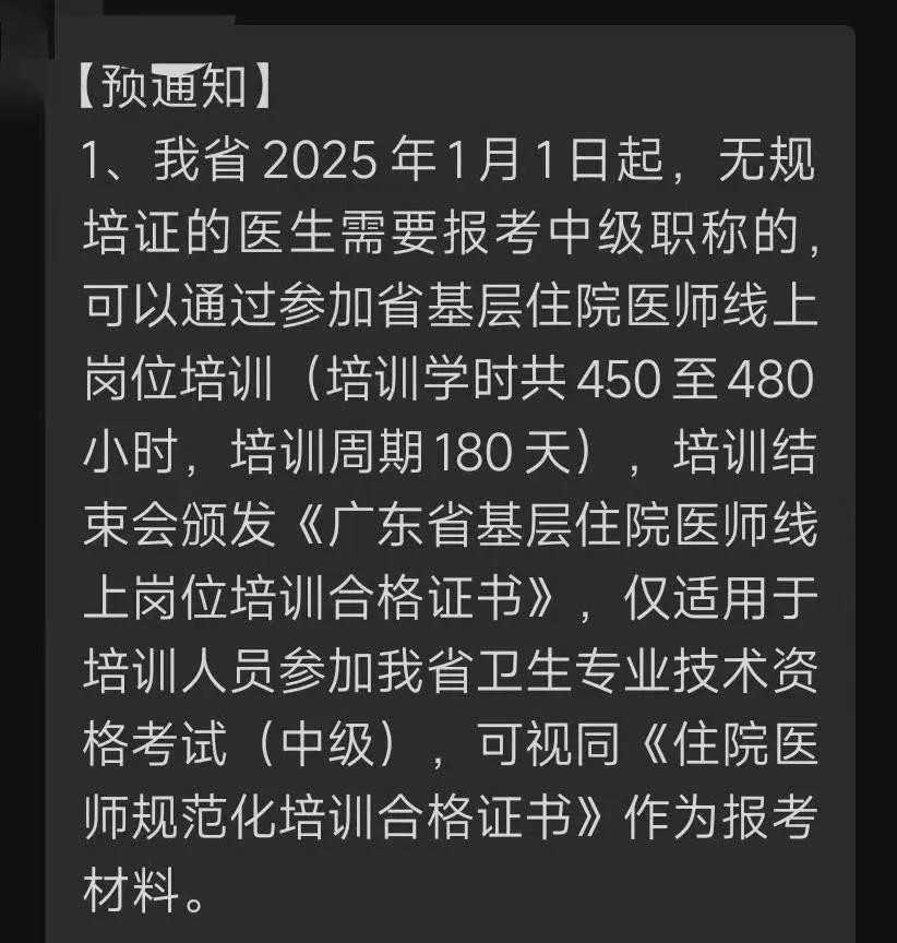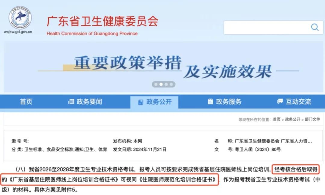 我省2026至2028年度卫生专业技术资格考试,报考人员可按要求完成我省基层住院医师线上岗位培训,经考核合格后取得的《广东省基层住院医师线上岗位培训合格证书》可视同《住院医师规范化培训合格证书》,作为报考我省卫生专业技术资格考试(中级)的材料。