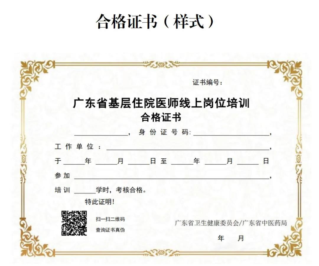 培训人员完成所有学时及课程练习后可按要求参加线上培训结业考核,考核通过后颁发《广东省基层住院医师线上岗位培训合格证书》(电子版),电子版合格证书每年11月1日至11月15日统一发放,由培训人员自行下载。