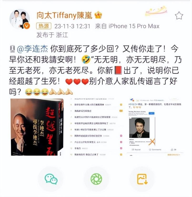 身为制片人,同时也是李连杰好友的向太陈岚,在收到消息的第一时间就发了微博解释。