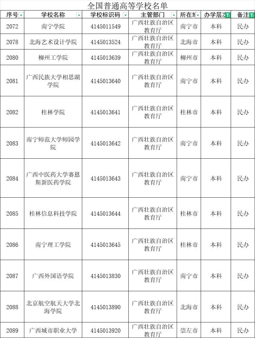 按照国家教育部网站信息,截至2022年5月31日,广西的普通高等学校共计85所,其中:本科院校38所,高职(专科)院校47所、本科层次的职业高校0所;这85所高校里,没有1所属于中央部委承办,比起东北区域,华北区域和华东的各省份而言,这个数量属于最低的。而占比最多的是,59所高校由广西自治区承办,还有26所由广西的教育厅承办;其中12所本科院校,14所专科院校。由此可见,广西的高校全部都是省属高校,没有1所是由中央部委承办的,总体数量名列全国中下,不足100所。