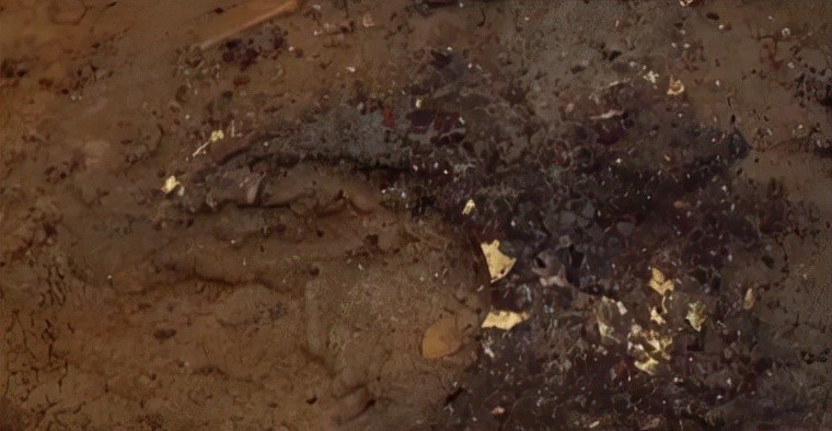 就在继续挖掘破碎的金箔时,却发现金箔的下面有着浅浅的灰色痕迹。