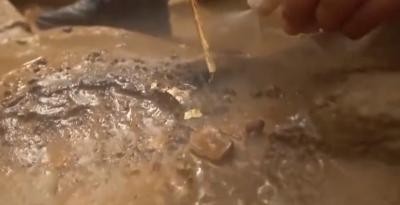 随着水流的范围逐渐扩大,而泥土里面的金箔面积也越来越大。