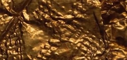 经过长时间的挖掘,将所挖掘到的金箔一点一点地拼凑到了一起。