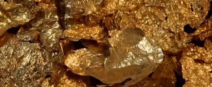 而散落的金箔块,有的还能看出些灰痕并呈圆弧状的边,有的便聚在一起。