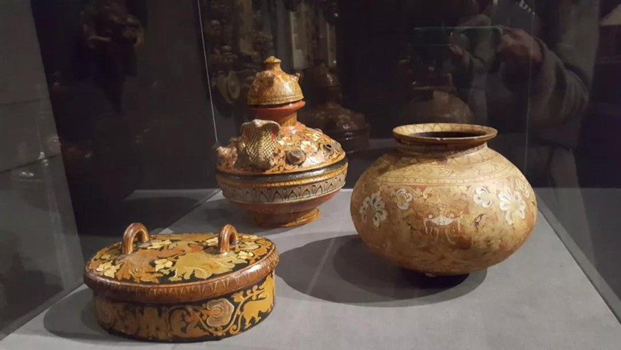除了佛教的艺术作品,还有一组很重要的展览作品——圣殿的墙板遗迹,这些墙板就是佛教徒将印度神纳入万神殿的最好证明。在节日和治疗仪式中使用的面具、绘满图画的陶制器皿更加证实了宗教在民间大众的日常生活中的重要地位。