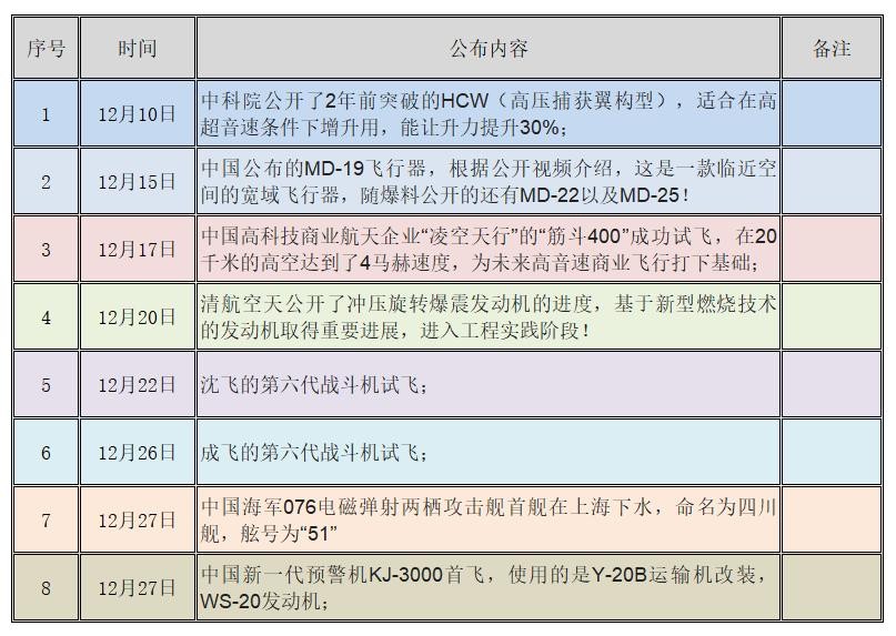 从去年年底开始,中国已经一改过去以经济与合作以及用委婉的叙事方式告诉对方中国已经很强大,中国人一向非常内敛,不习惯锋芒毕露,但是很无奈啊,全世界的国家中没有几个有内涵,完全看不懂中国这是啥意思,所以就只能用西方以及与中国为敌或者打算以中国为敌的国家能看懂的方式说话与做事了!简单罗列下,从去年年底以来中国公开了多少武器与科技突破: