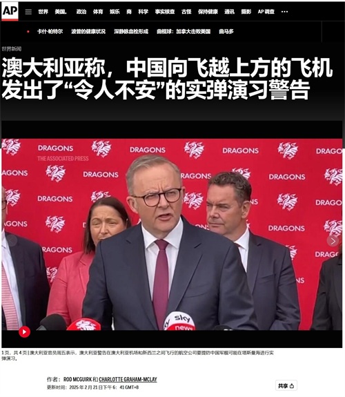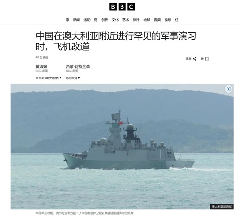 BBC报道:中国在澳大利亚附近进行罕见军事演习,飞机改道;彭博社报道:中国对实弹演习警告,导致澳大利亚附近航班改道;美联社报道:澳大利亚称,中国向飞越上方的飞机发出了“令人不安”的实弹演习警告;新西兰先驱报:由于中国在塔斯曼海域的“实弹”军事演习,跨塔斯曼海域航班改道;美媒The Hill报道:澳大利亚称,中国向飞越上方的飞机发出了“令人不安”的实弹演习警告;