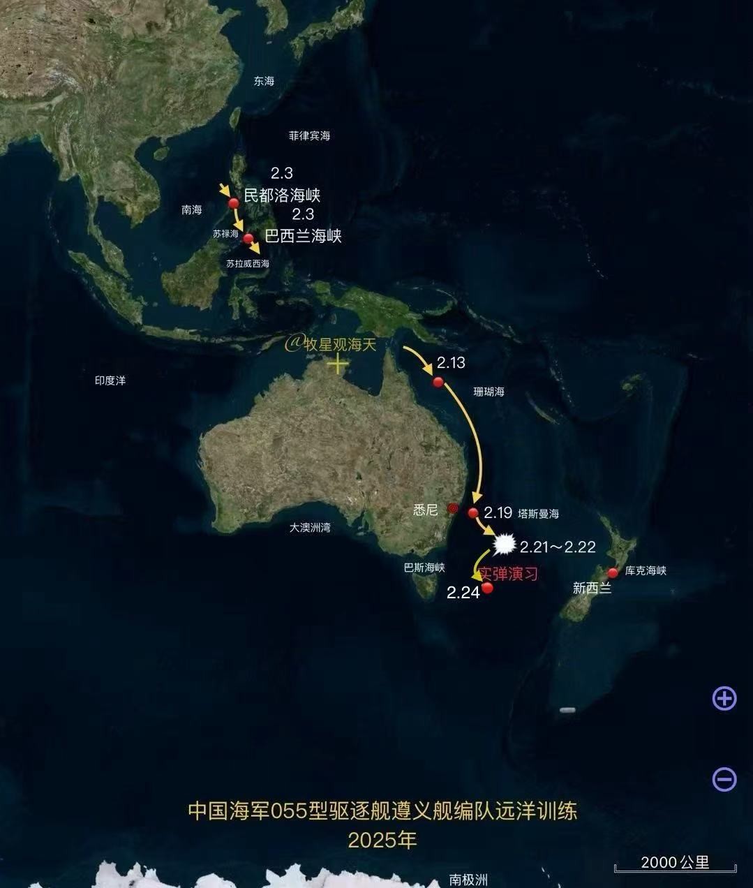 2月21日:以(37S,157.02E)为圆心,半径40海里范围进行实弹射击演习,距离悉尼约620公里(约330海里);2月22日:遵义舰编队在附近海域进行了第二次实弹演习;2月24日:遵义舰编队位于塔斯马尼亚岛以东280海里处(约518公里);