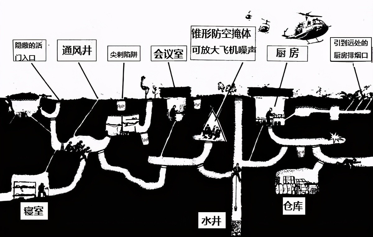 越南境内树林遍布,既有高大的树木和竹子做建材,也有低矮的灌木和藤蔓做掩护。当地的红土和黏土也适合开挖地道,就地取材就行。至于缴获自美军的材料就更丰富了,包括各种金属板材、弹药罐,尼龙防水布,沙包等。