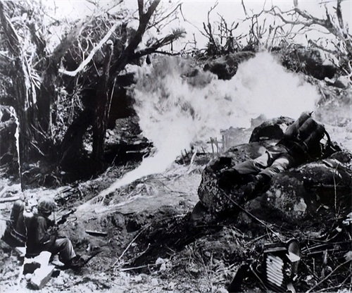 面对躲藏在堡垒和地下的日军,美国人想尽办法,火焰喷射器、推土机等统统利用上,但是仍有不少冷枪不知从何处打出。