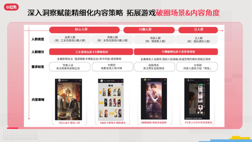 对核心人群来说,该游戏精美的二创、卡牌组合攻略,足以引起他们的注意;情感类人群可能更关注游戏中的恋爱剧情,硬核的玩法攻略反而留不住他们;面对更外层、更泛化的成长进阶人群,玩家和妈妈探讨游戏男主、分析哪个男主更适合该玩家的笔记,则更容易引发该类目人群的共鸣。